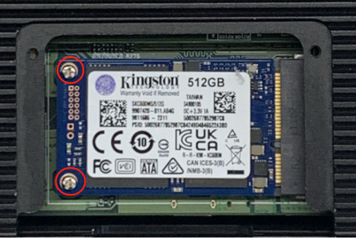 Step 2: Align the hard drive with the slot, push it to the right and snap it into place; Remove the screw (M2) to secure the left side of the hard drive.