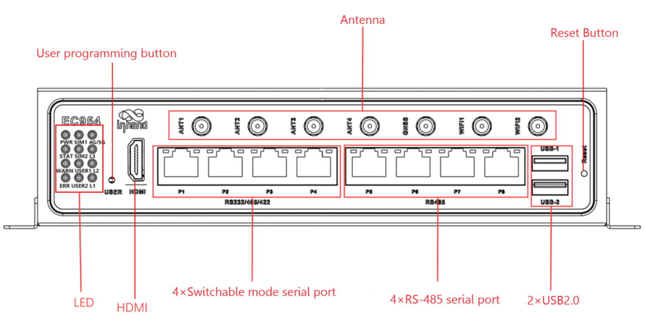 EC954 has a total of 7 antenna interfaces, and different models are equipped with different numbers of antennas. Specific models corresponding to the antenna support can be found in the "EC954 Series Edge Computer Product Specification" in the "Ordering Information" section.