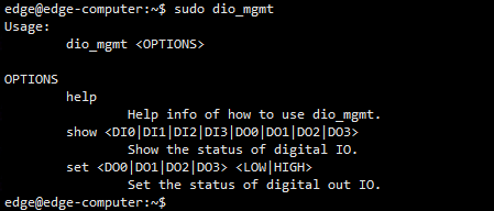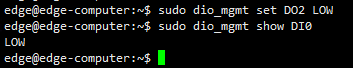 When you need to set a certain IO port to high or low, you can type the command dio_mgmt set D<I/O><number><HIGH/LOW>