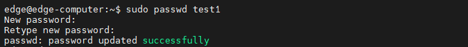 Change the password for test1, use the passwd command, enter the new password, and then repeat the process to confirm the change