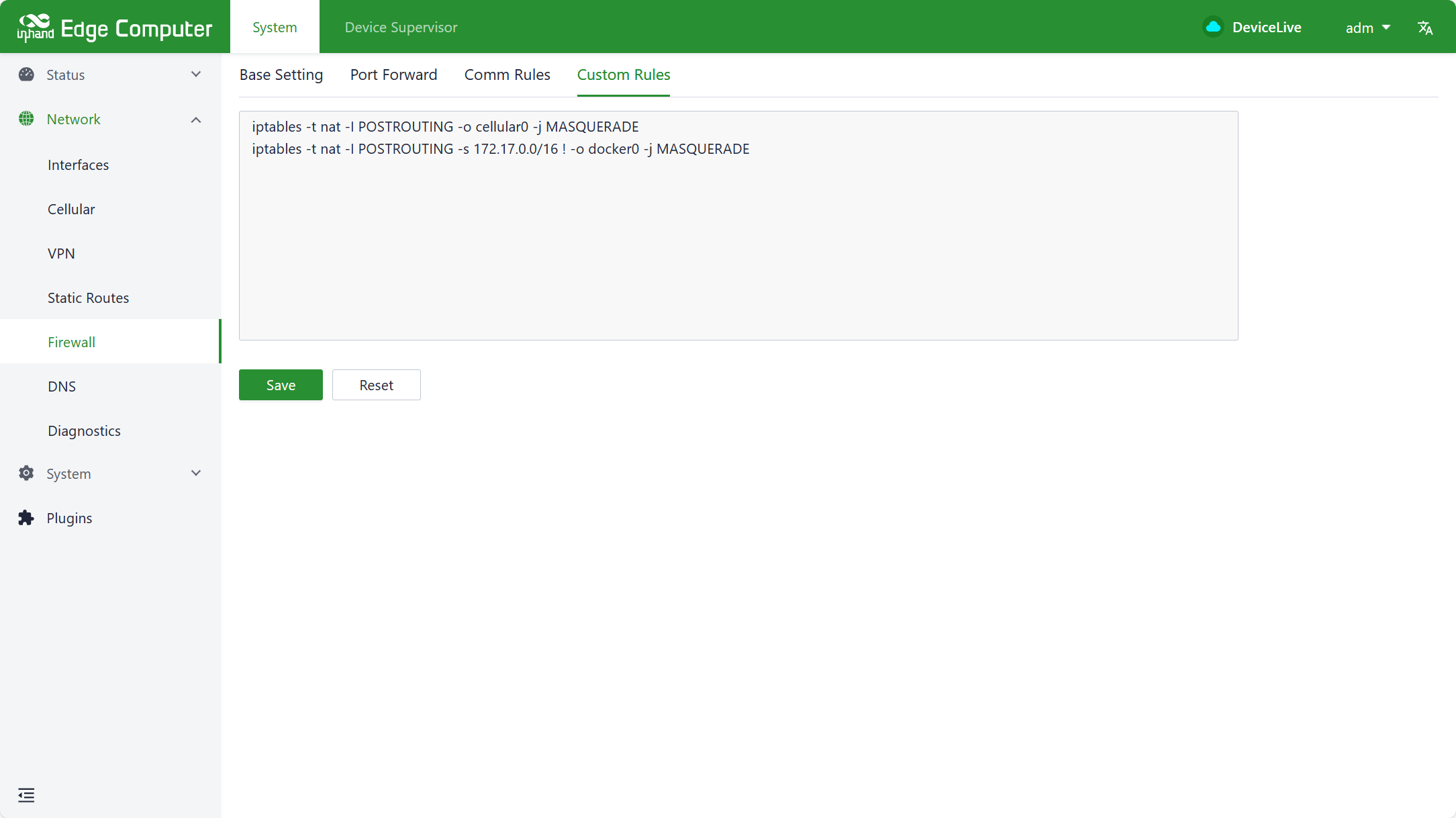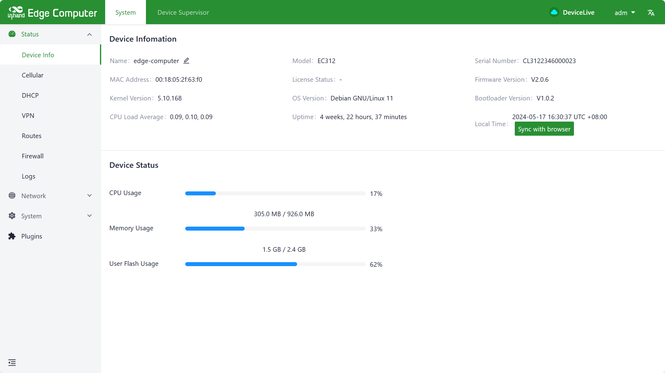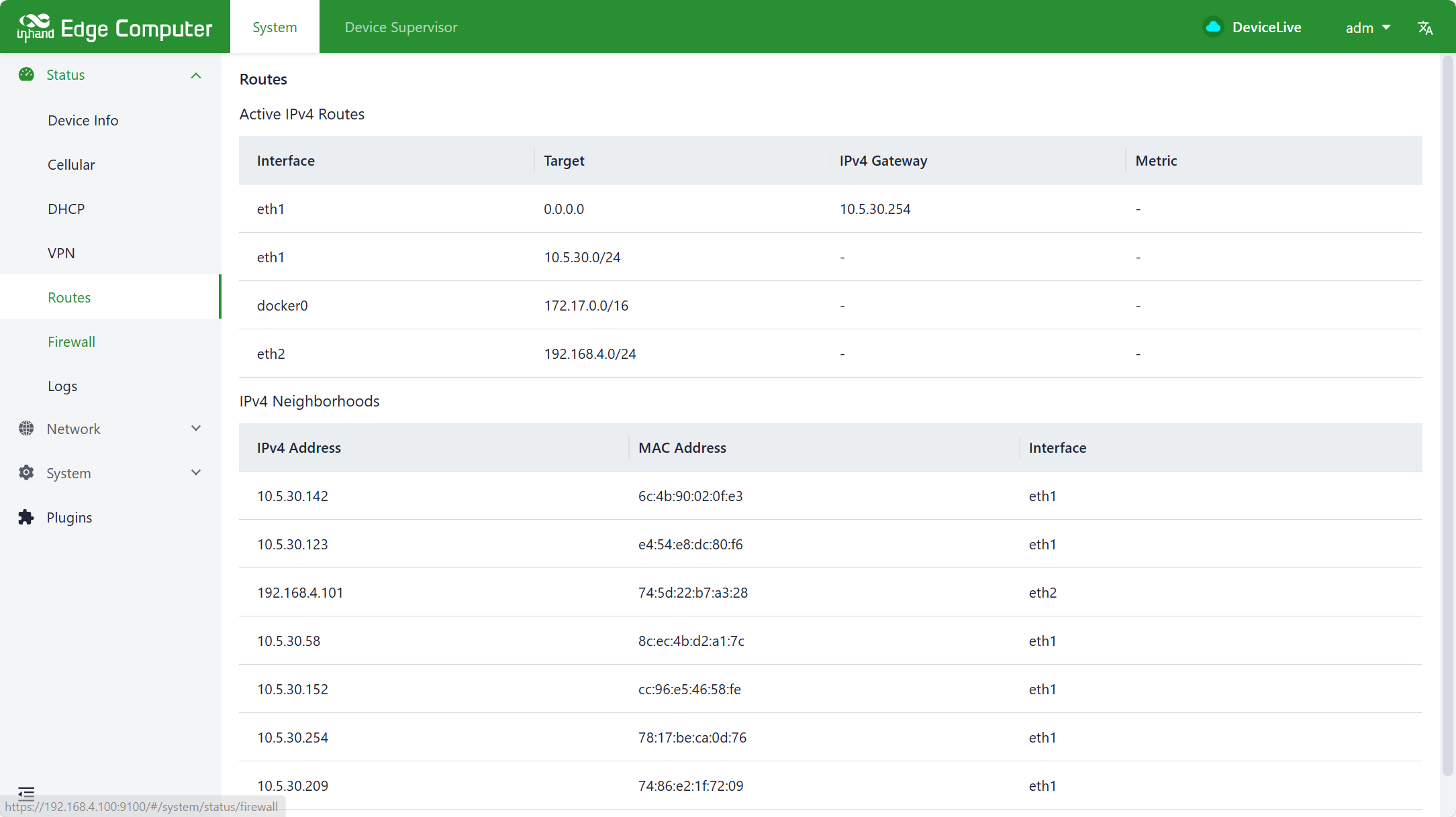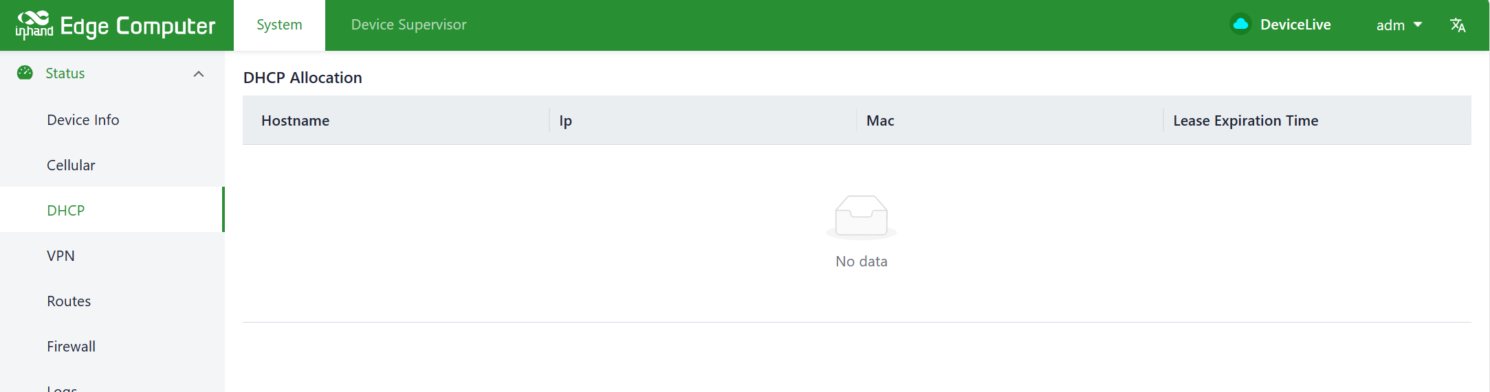IEOS is a network management and system management program developed by InHand that runs on Linux systems. IEOS provides a web interface, allowing users to configure Ethernet IP addresses, cellular dialing, Wi Fi Station, DHCP Client/Server, static routing, firewalls, and other network configurations through the web; You can also perform operations on system time, time zone, firmware upgrades, and system restarts; In addition, IEOS also supports integration with InHand's device management platform DeviceLive, allowing users to remotely monitor and manage EC954 devices through the DeviceLive platform.