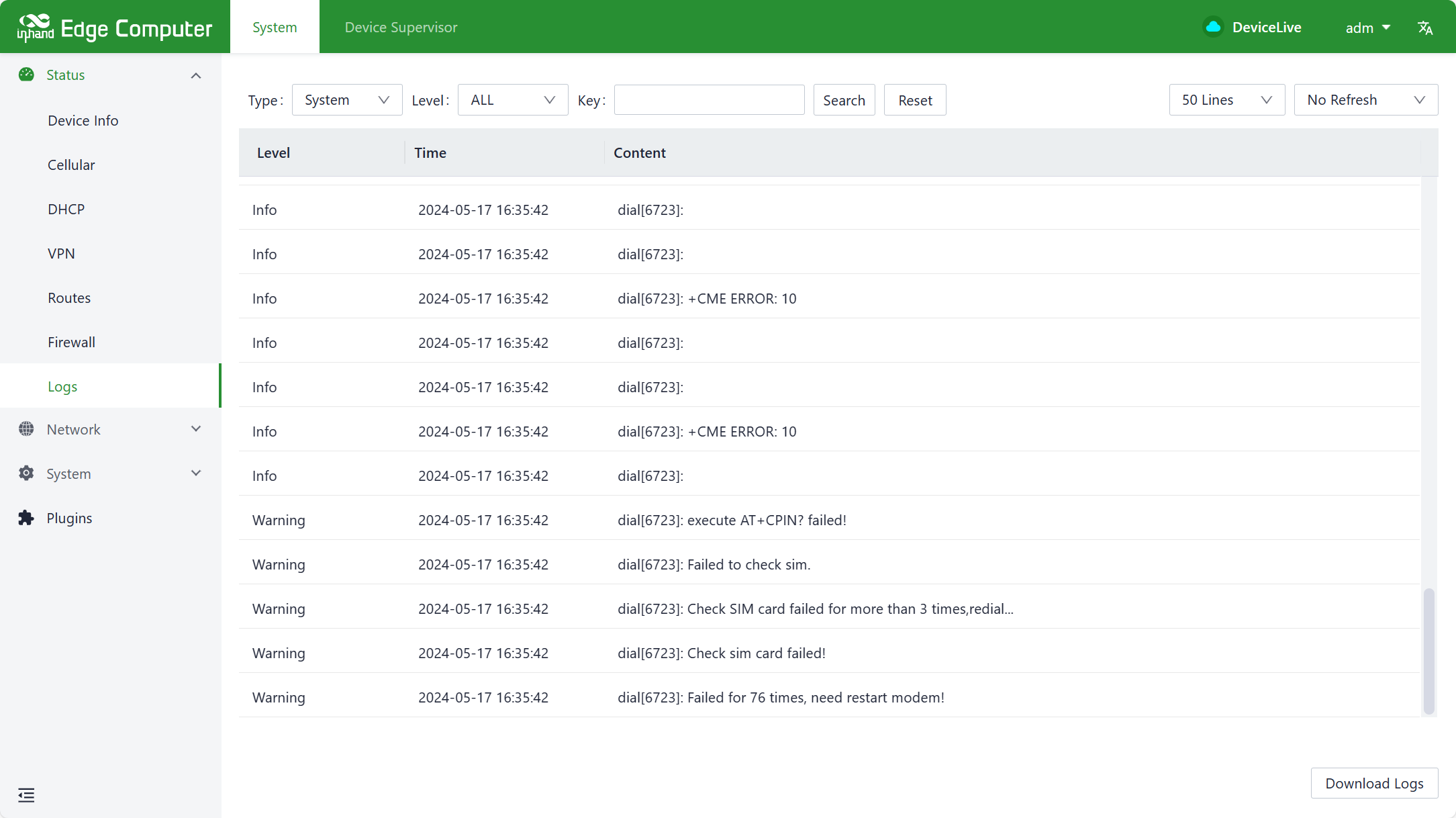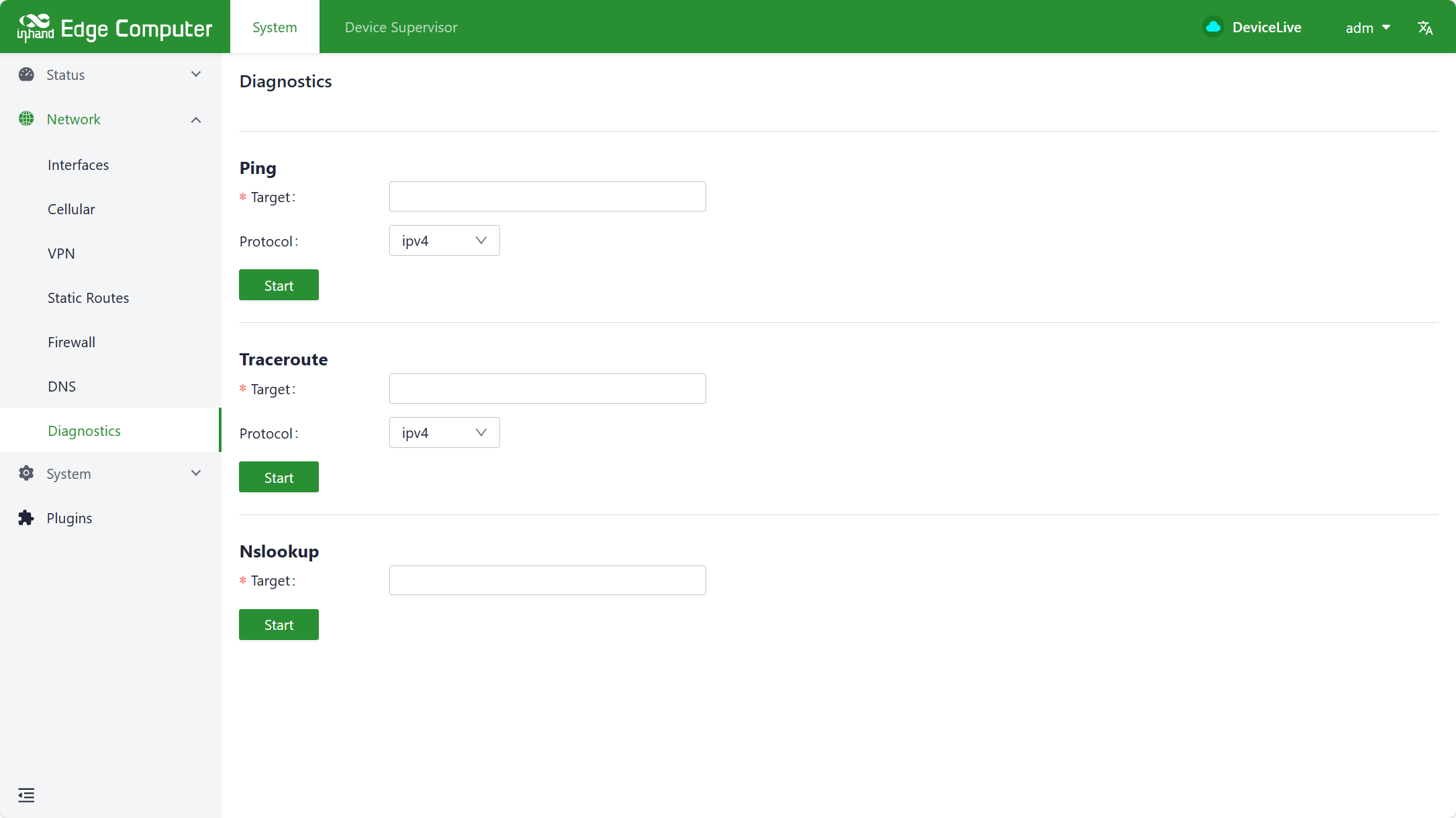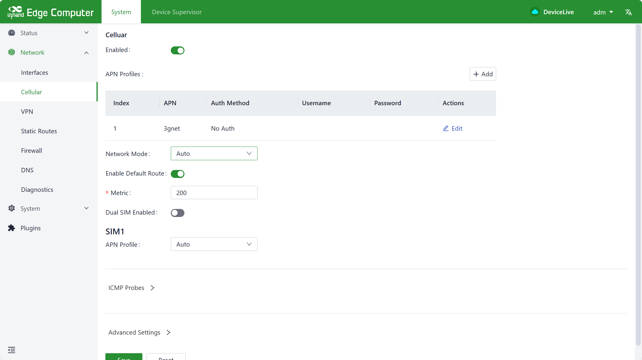 IEOS is a network management and system management program developed by InHand that runs on Linux systems. IEOS provides a web interface, allowing users to configure Ethernet IP addresses, cellular dialing, Wi Fi Station, DHCP Client/Server, static routing, firewalls, and other network configurations through the web; You can also perform operations on system time, time zone, firmware upgrades, and system restarts; In addition, IEOS also supports integration with InHand's device management platform DeviceLive, allowing users to remotely monitor and manage EC954 devices through the DeviceLive platform.