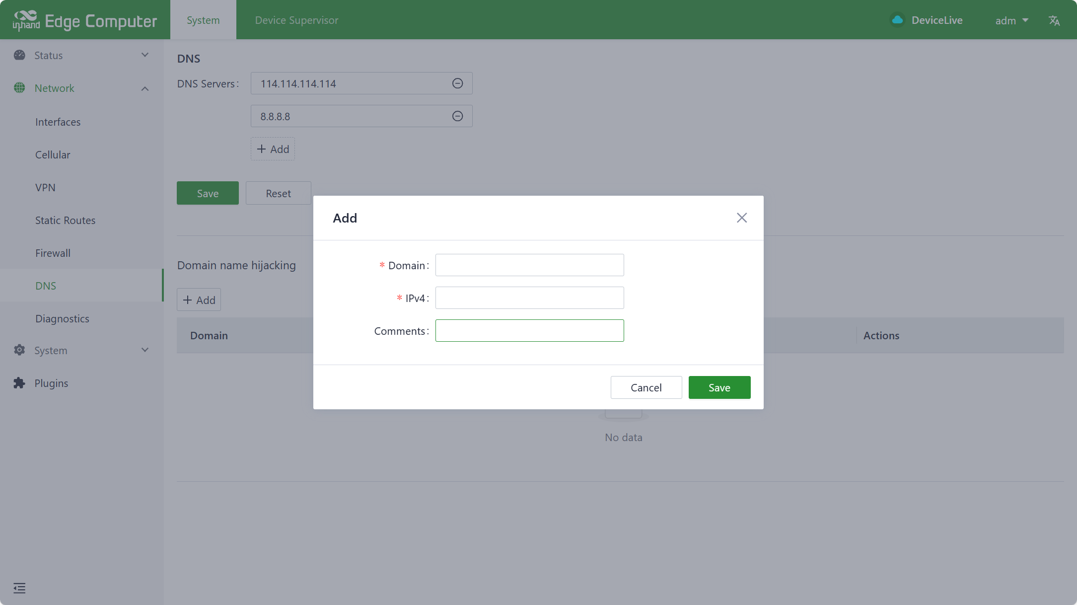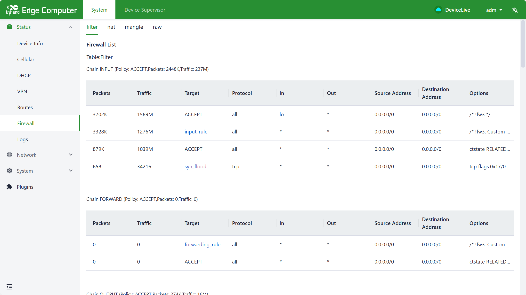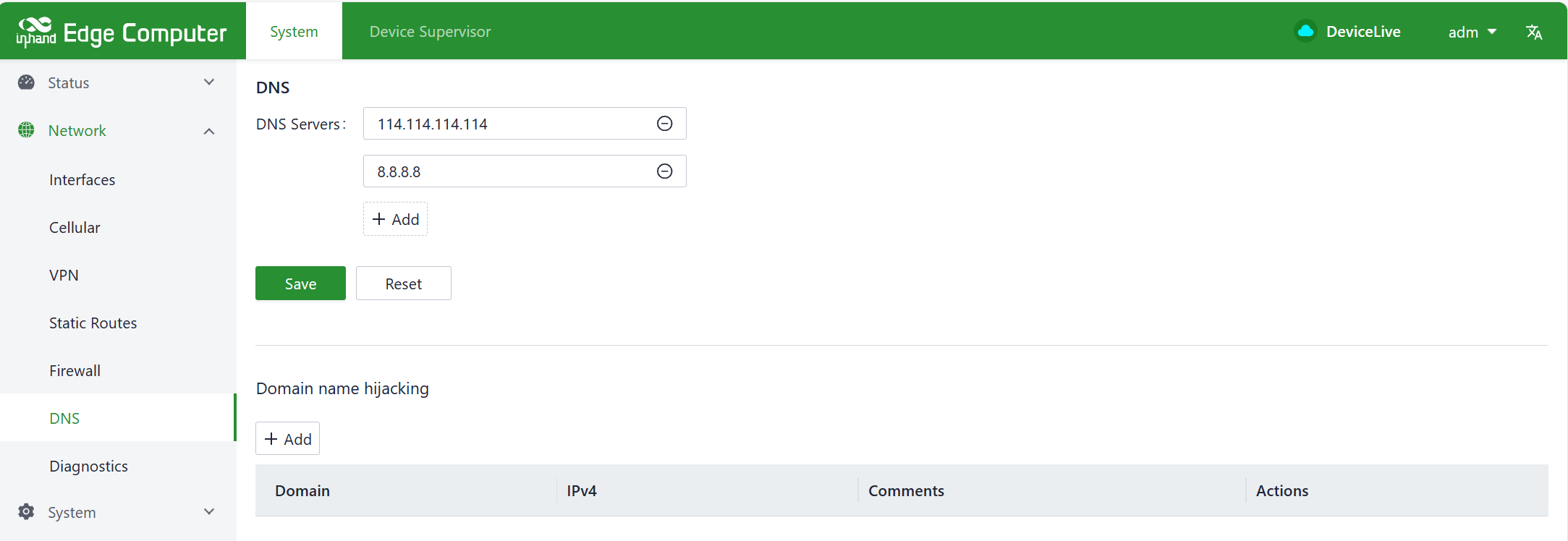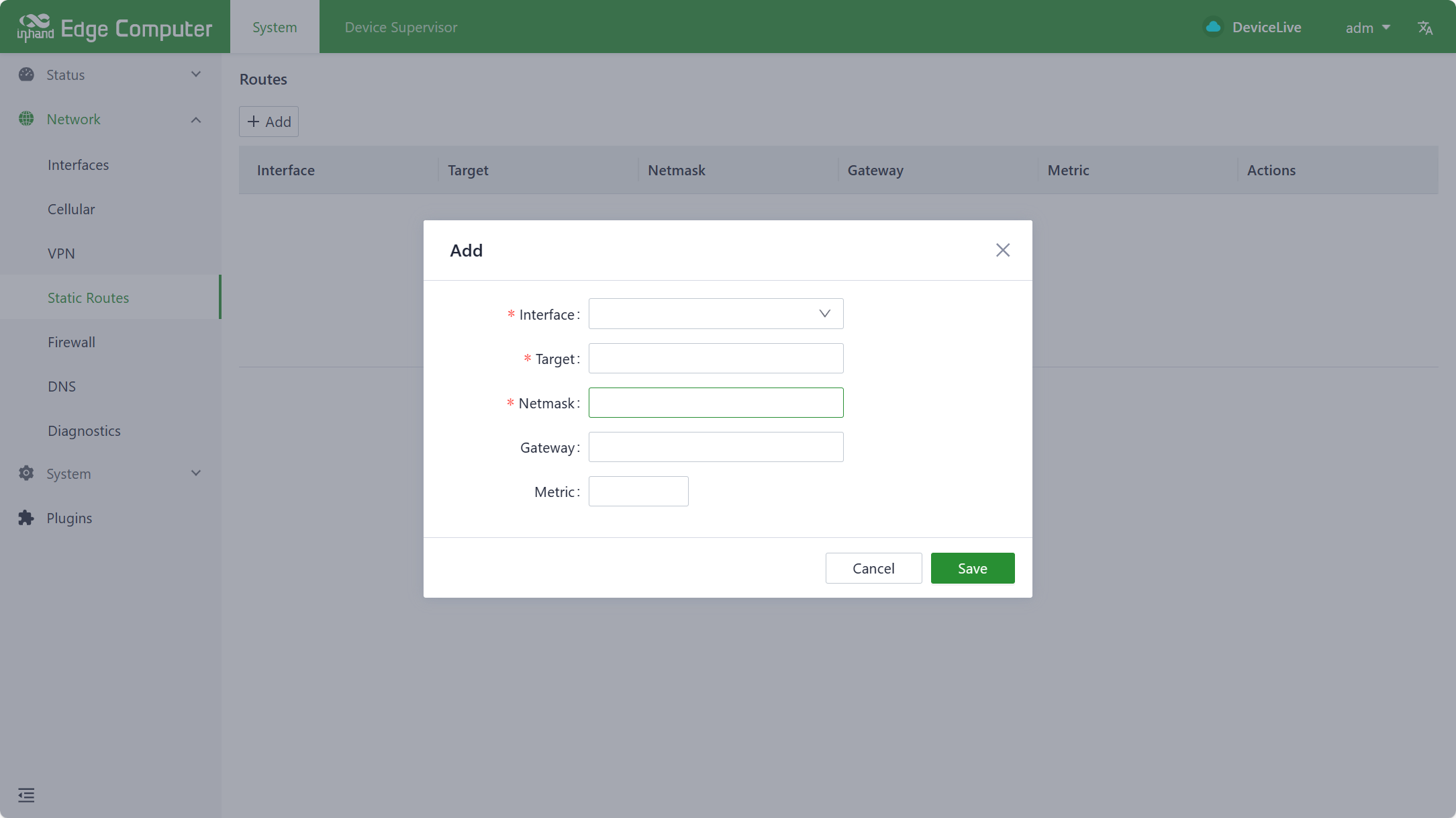 IEOS is a network management and system management program developed by InHand that runs on Linux systems. IEOS provides a web interface, allowing users to configure Ethernet IP addresses, cellular dialing, Wi Fi Station, DHCP Client/Server, static routing, firewalls, and other network configurations through the web; You can also perform operations on system time, time zone, firmware upgrades, and system restarts; In addition, IEOS also supports integration with InHand's device management platform DeviceLive, allowing users to remotely monitor and manage EC954 devices through the DeviceLive platform.