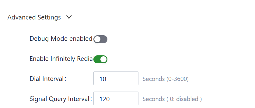 Dual SIM enabled: enables the dual SIM feature. EC954 supports dual card single dial to improve network reliability. Two SIM cards need to be inserted into the device. After enabling this function, if the SIM card 1 fails to dial due to arrears, it will automatically switch to the SIM card 2 for dialing. The default is off.