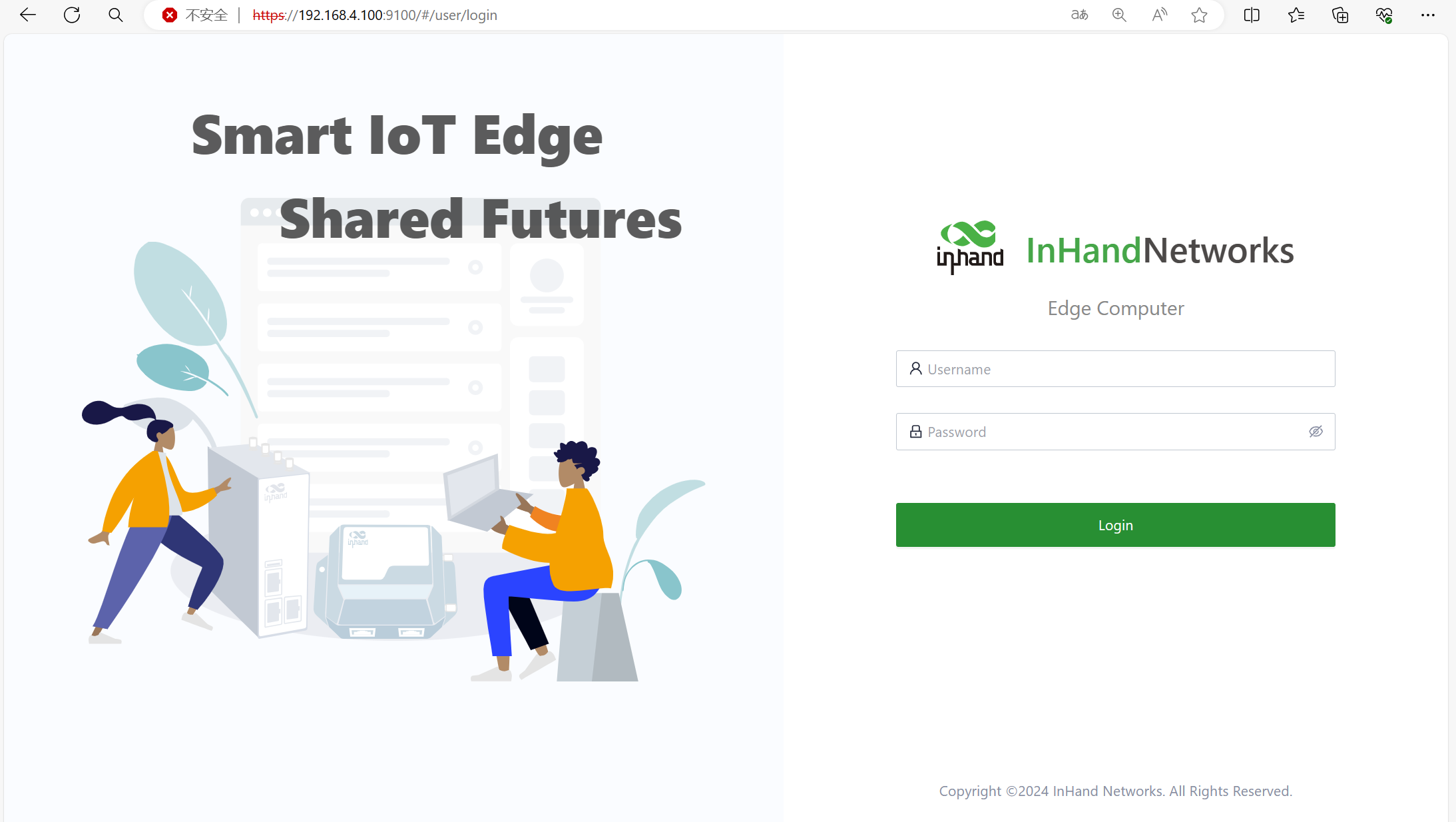 Considering that the user's program may require the use of HTTP/HTTPS standard port number 80/443, IEOS uses port number 9100 as the port for HTTPS connection and does not support access through HTTP; When users access the web using HTTP, they will automatically redirect to using HTTPS. This document takes the default address 192.168.4100 through eth2 as an example for explanation. After entering 192.168.4100:9100 in the browser, the user will be redirected to the login page