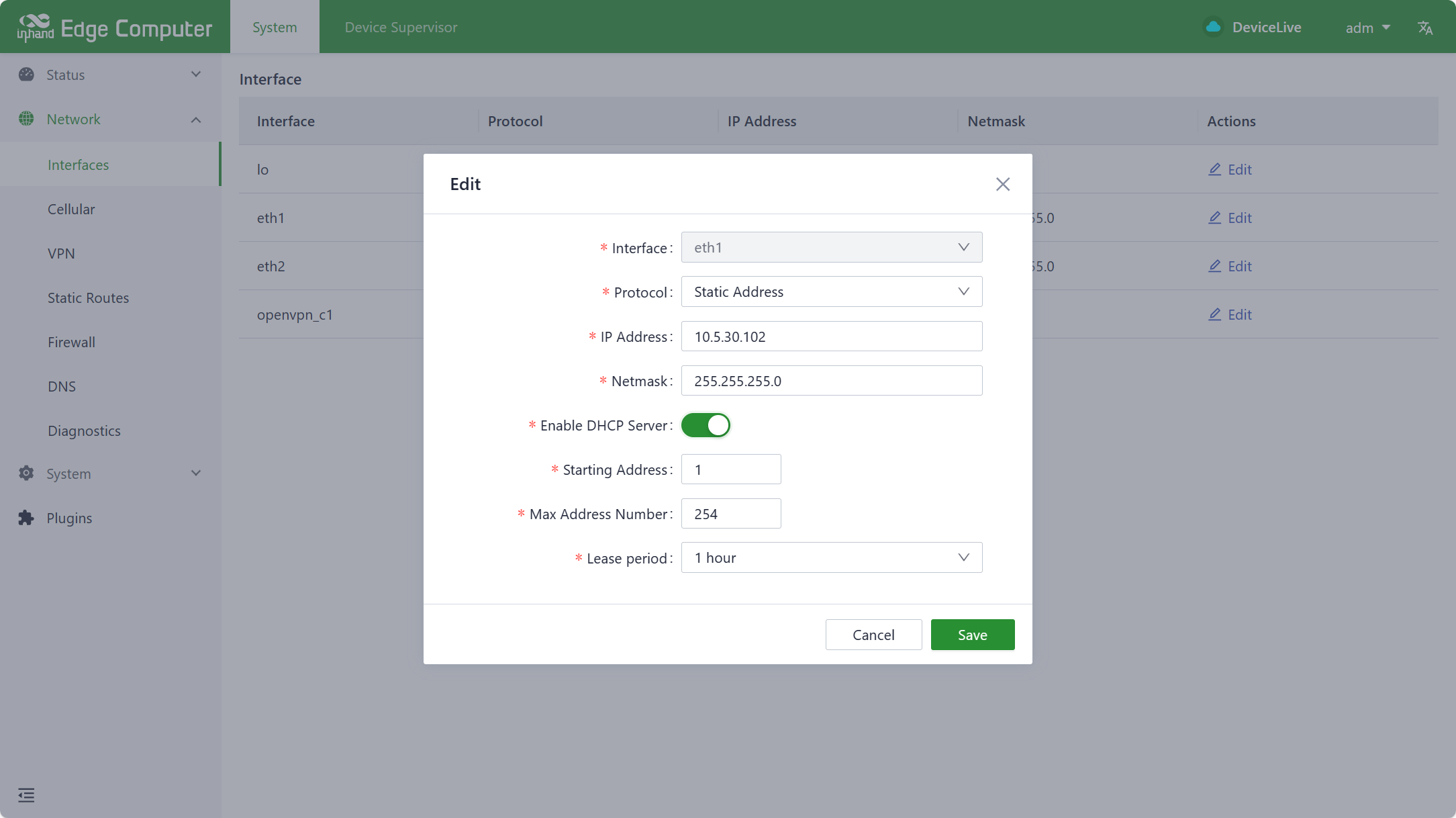 Starting Address: The starting base address of the DHCP Server address pool, where network segment+starting address=the starting IP address of the address pool. In the screenshot, the network segment of eth1 is 192.168.1.0/24, and the base address is 1, so the starting address of the address pool is 192.168.1.1/24