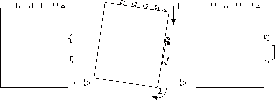 2. Turn the device in the direction of arrow 2 and move the lower end of the device outwards at the same time. Lift the device upwards after the lower end is detached from the DIN rail to remove the device from the DIN rail.