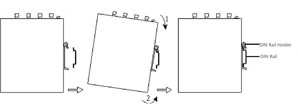 2. Snap the upper part of the DIN rail holder onto the DIN rail, and rotate the device at the lower end of the device with a little force upwards as shown in arrow 2 to snap the DIN rail holder onto the DIN rail, and confirm that the device is reliably mounted onto the DIN rail, as shown in the figure below: