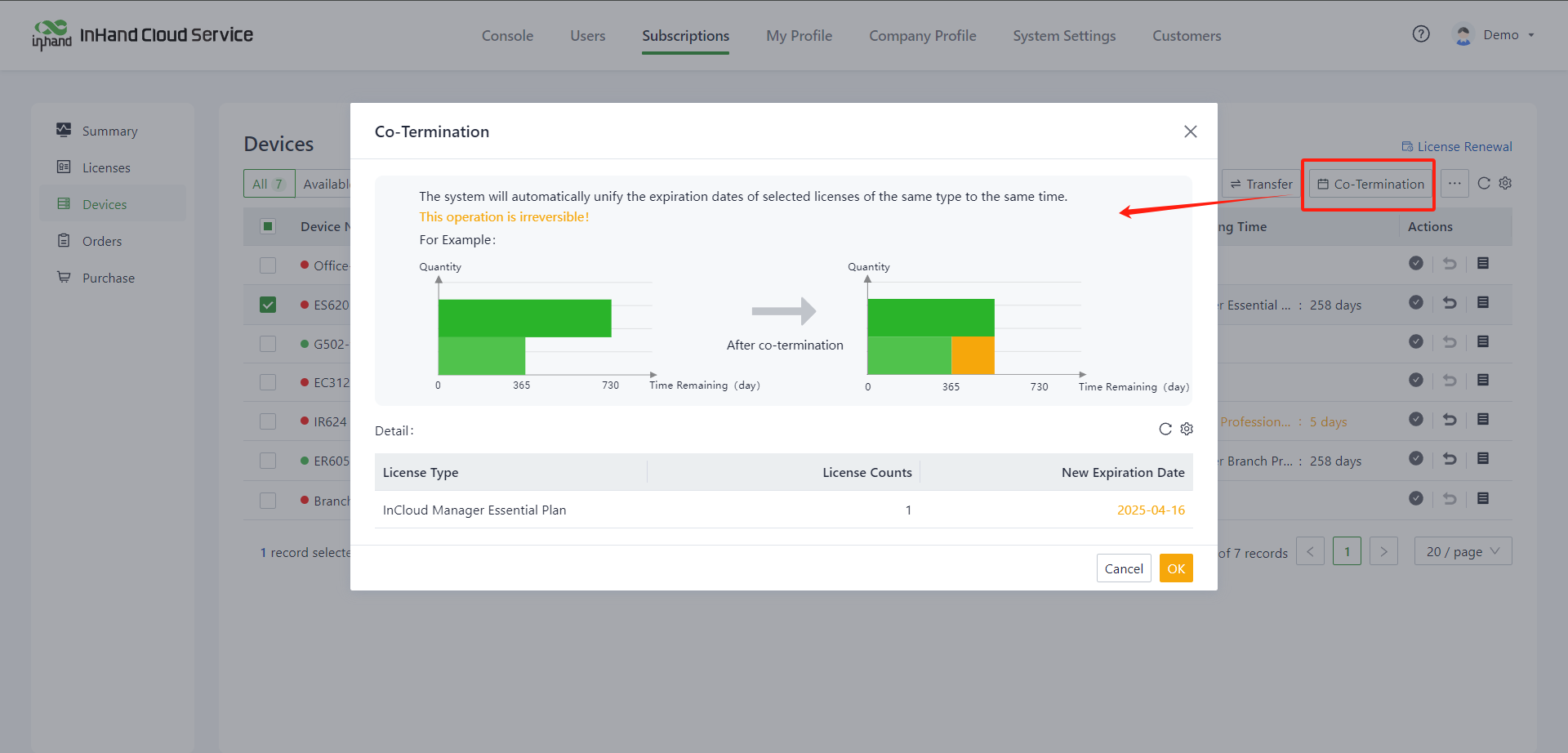When you need to align the expiration time of equipment licensing services, you can better manage your business and unify financial reconciliation and settlement. You can do the following: