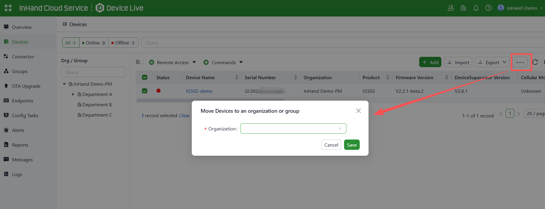 1. Select the device, click "Move", then select the organization or the group you want to move in