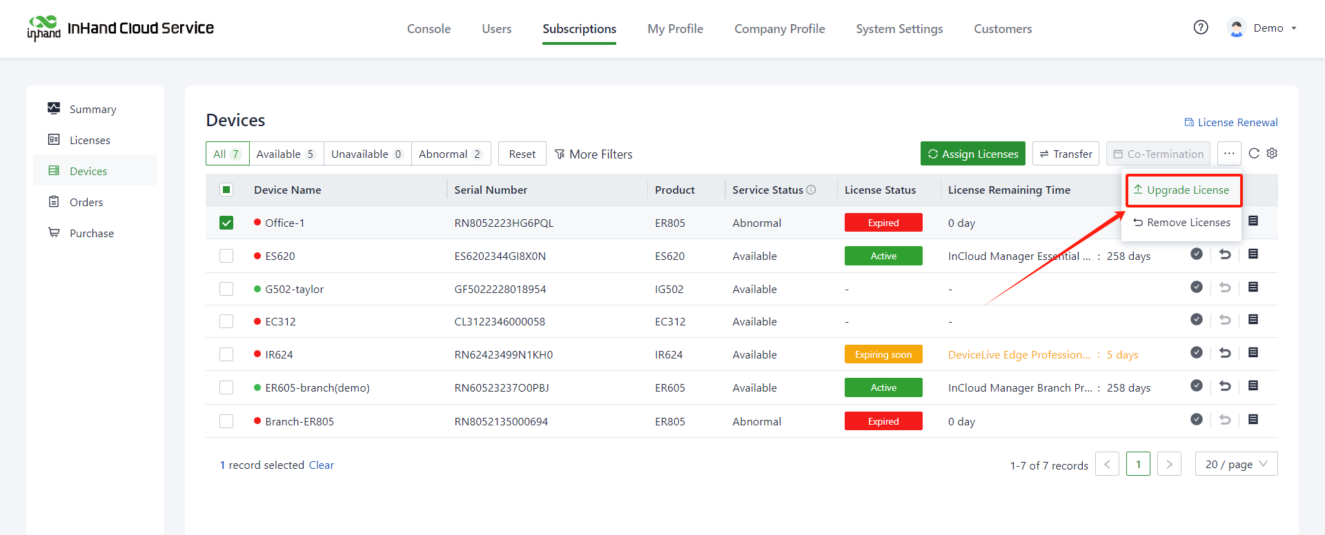 1. On the "Subscriptions>> Devices" page, click "Upgrade License" at the top of the device list.