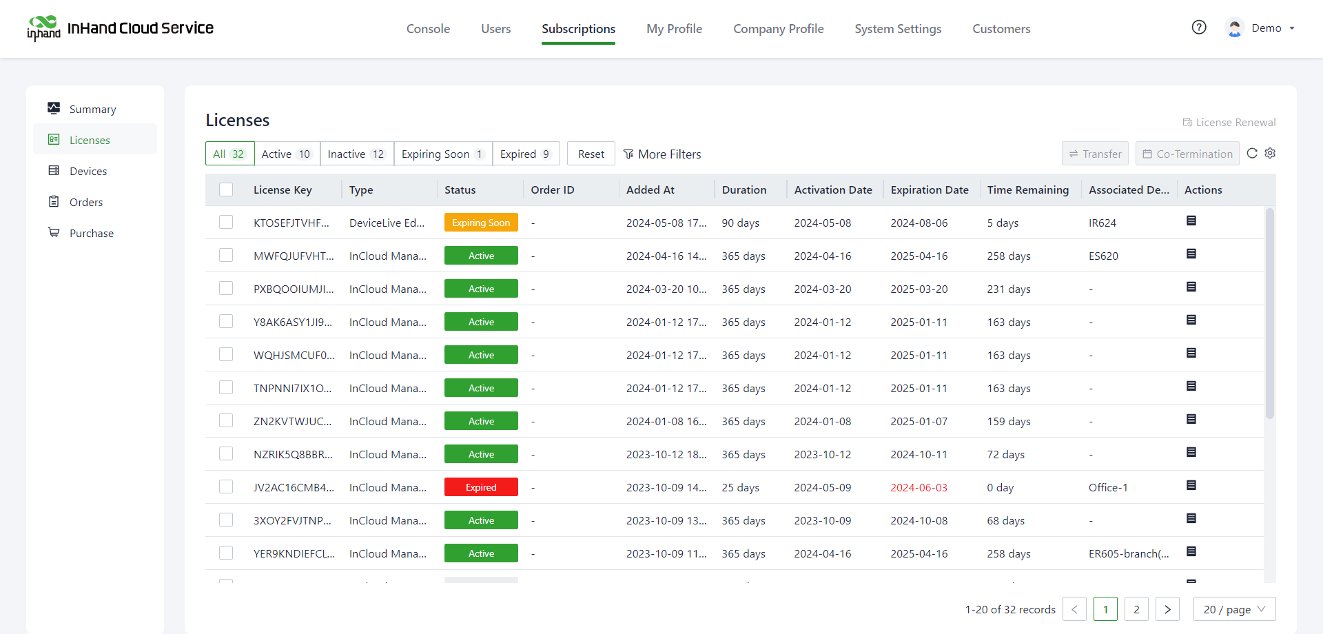 On the "Subscriptions>> Licenses" page, you can view the purchased licenses, and the license information includes the following: