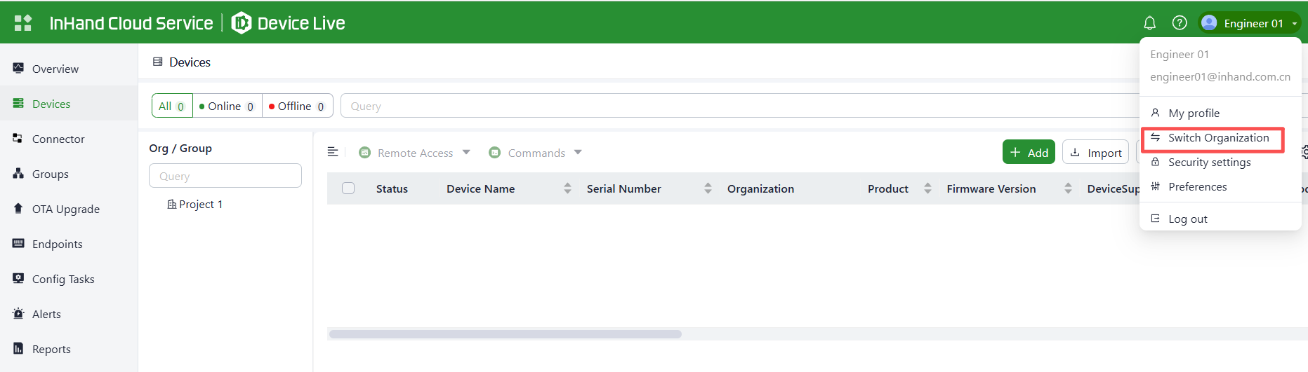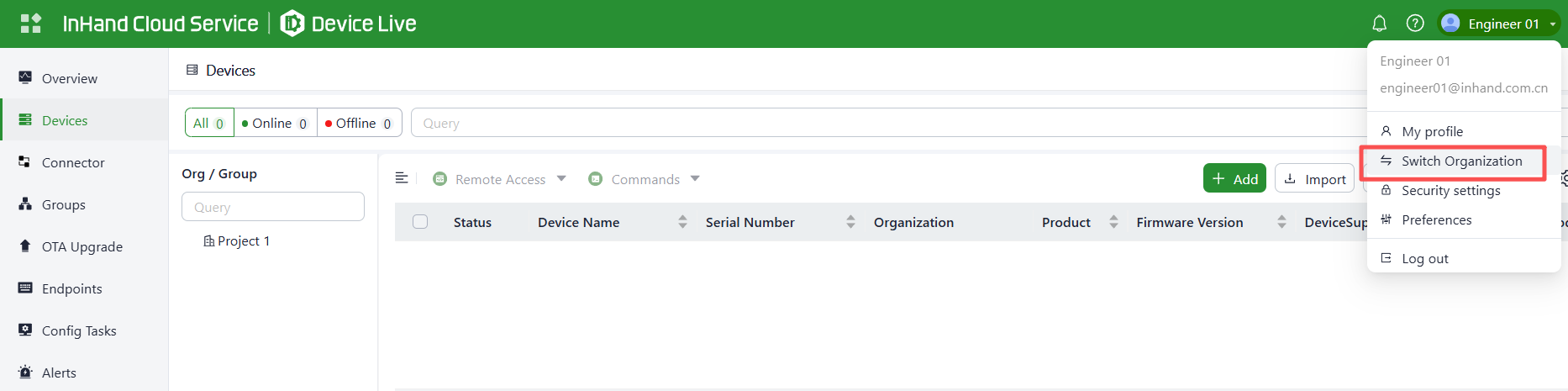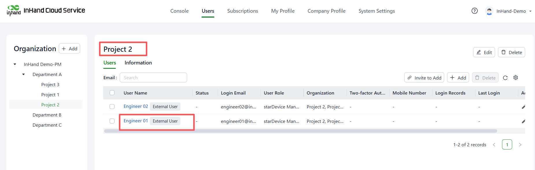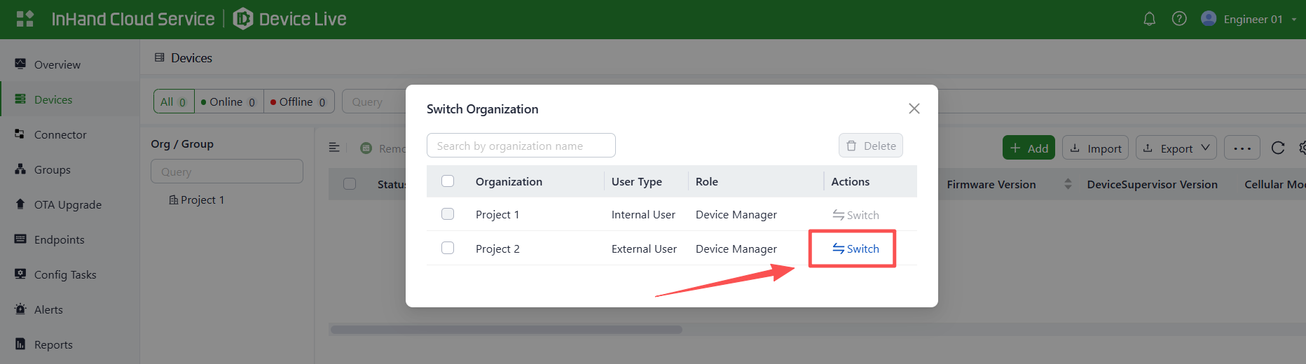 On the InHand Cloud Service, you can add Engineer 01 to the organizations of Project 1 and Project 2, and add Engineer 02 to the organizations of Project 3 and Project 2. This fulfills the requirement for one engineer to manage multiple projects. Follow these steps: