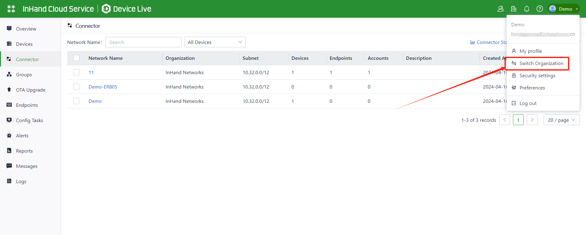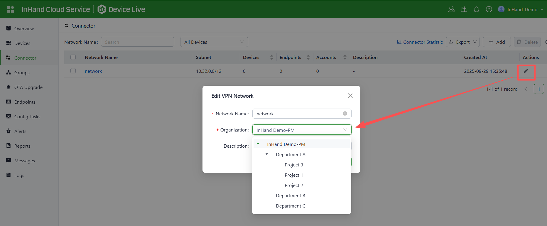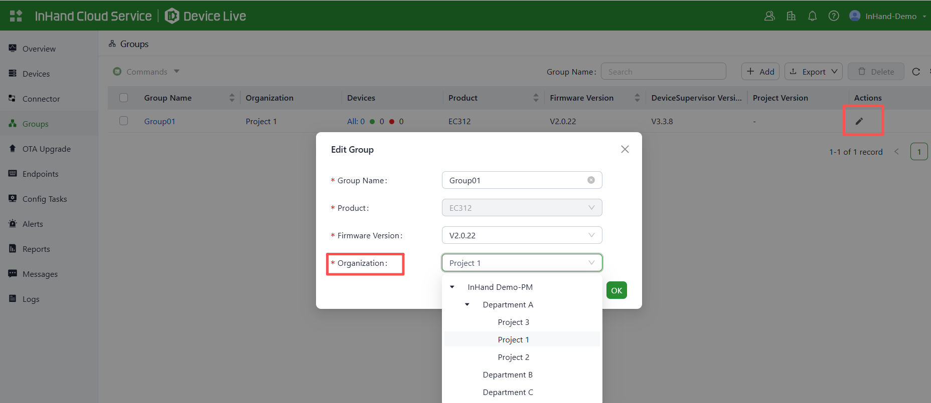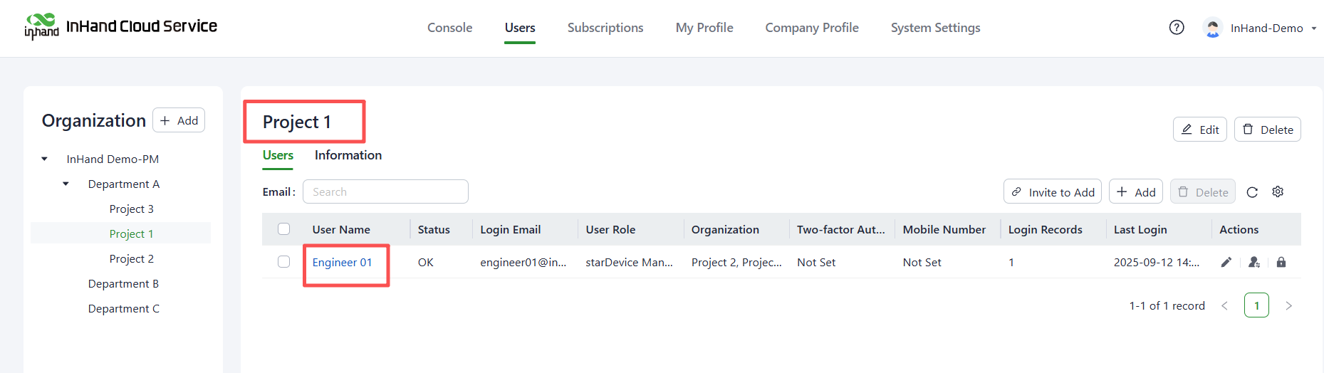 On the InHand Cloud Service, you can add Engineer 01 to the organizations of Project 1 and Project 2, and add Engineer 02 to the organizations of Project 3 and Project 2. This fulfills the requirement for one engineer to manage multiple projects. Follow these steps: