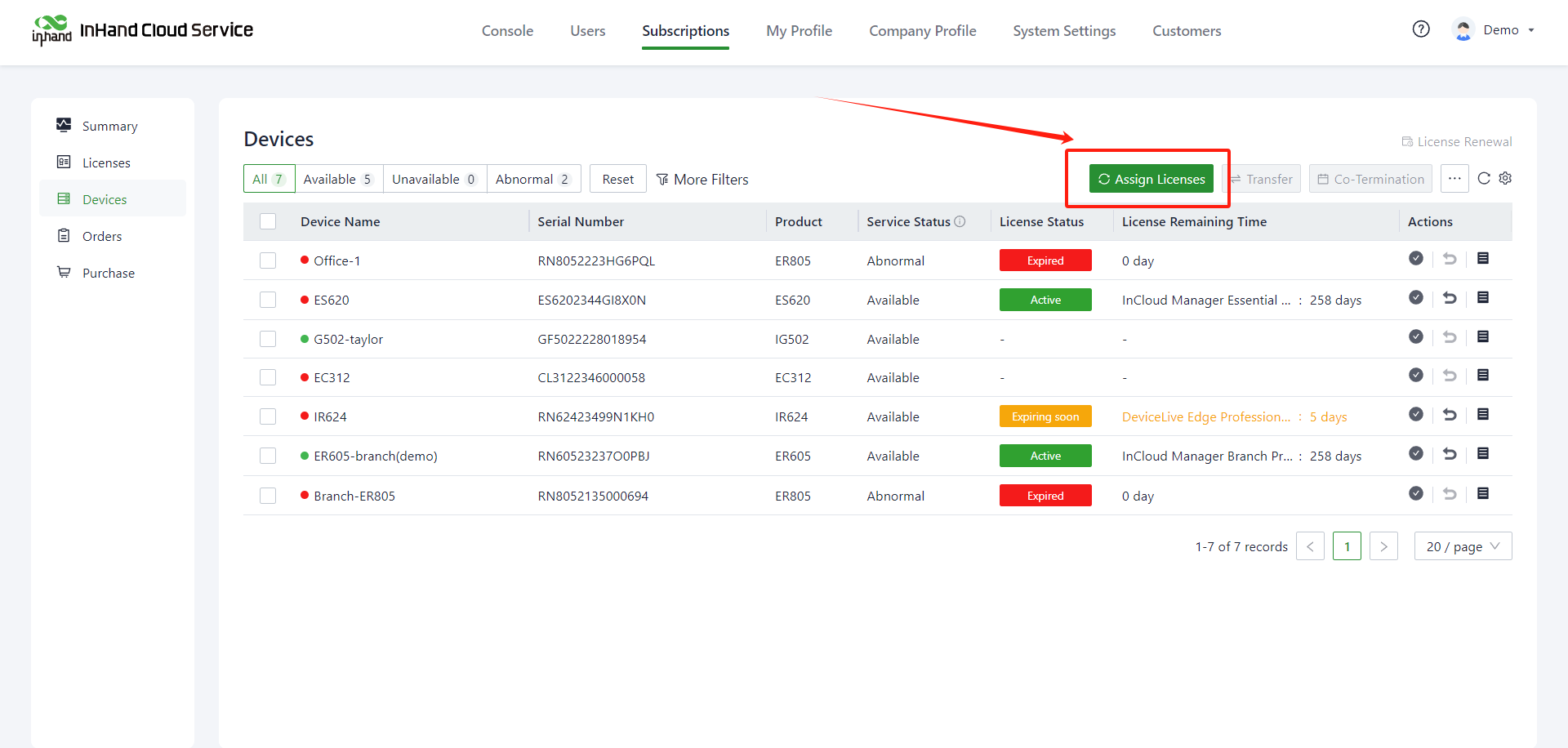 1. In the "Subscriptions>> Devices" page, click on "Assign Licenses" above the device list.