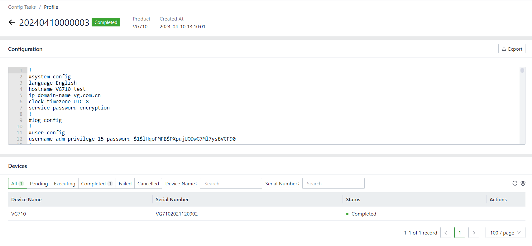Configuration Status | Device Configuration Synchronization Status Ratio Information, including the following configuration states: