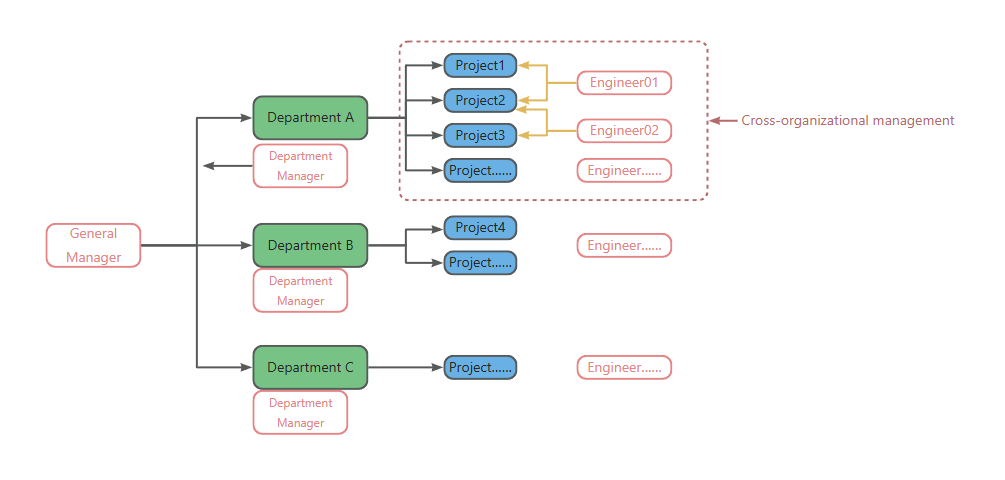 As shown below: The General Manager needs to view data from all departments, while each department manager needs to view data specific to their own unit. Engineer 01 manages Project 1 and Project 2, while Engineer 02 manages Project 3 and also needs to manage Project 2.