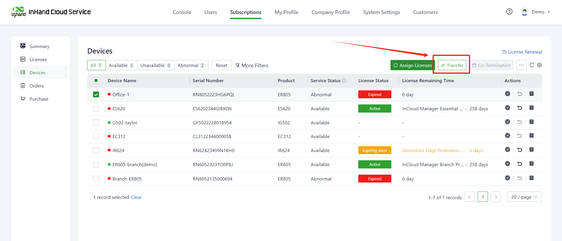 On the "Subscriptions>> Devices" page, you can manage the application of licenses to devices, which includes the following functions: