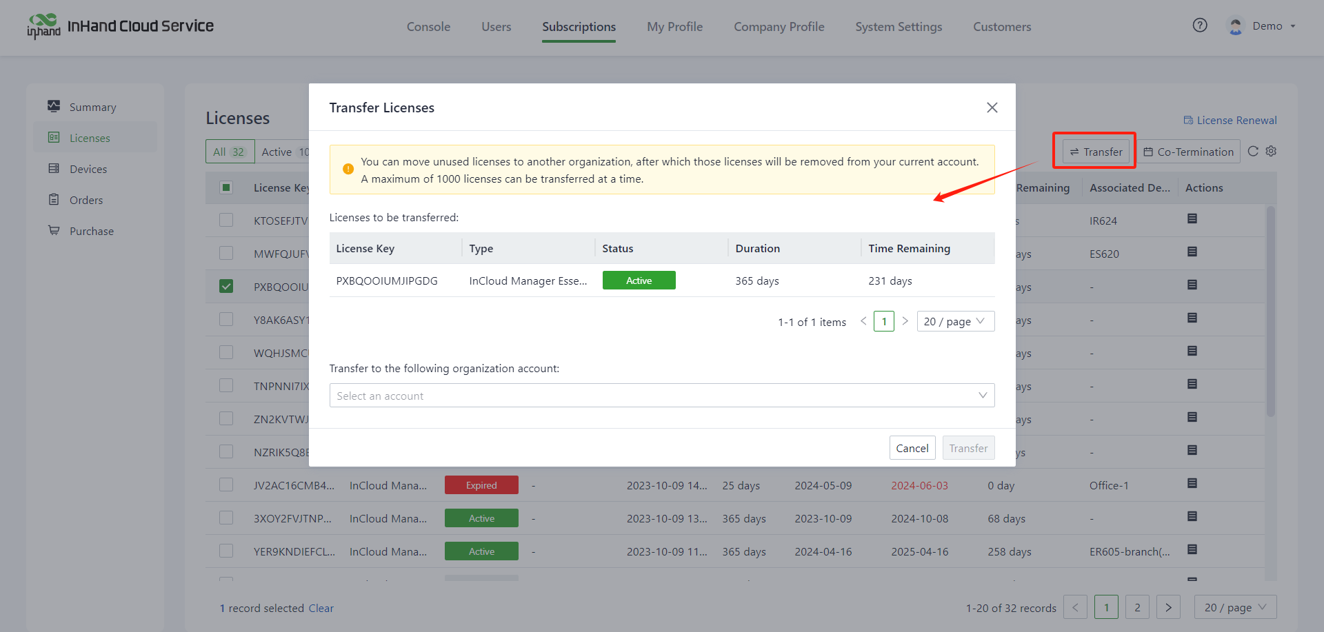 4. In the "Transfer Licenses" popup, confirm the license you want to transfer, select the customer, and click "Transfer" to complete the transfer successfully.