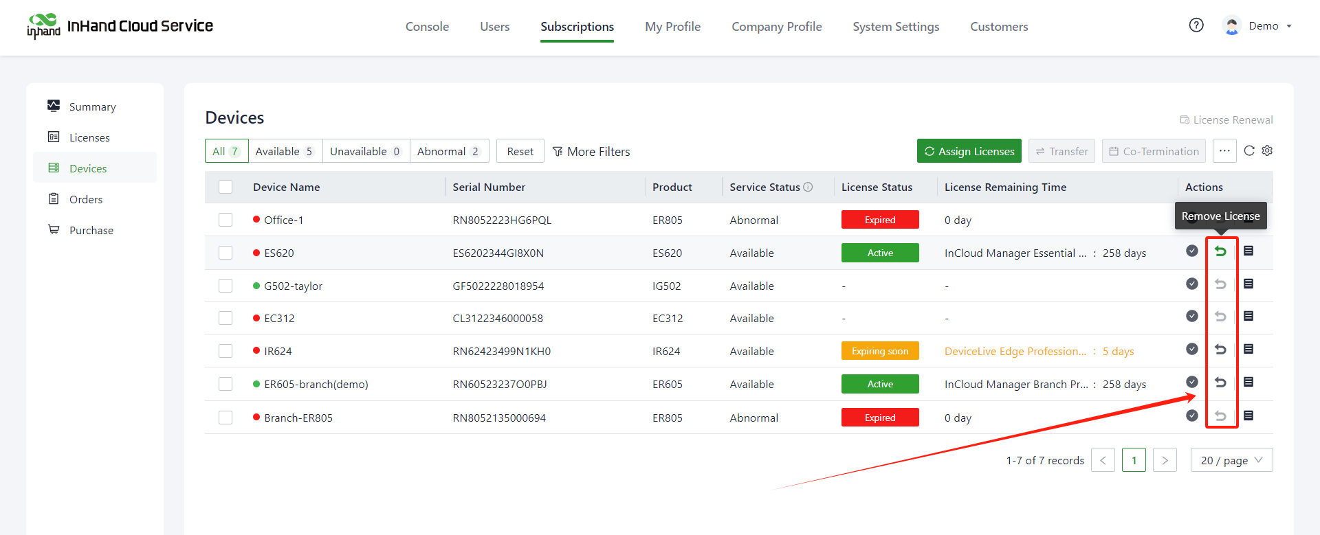 1. On the "Subscriptions>> Devices" page, click the "Remove License" option in the action column for the target device.