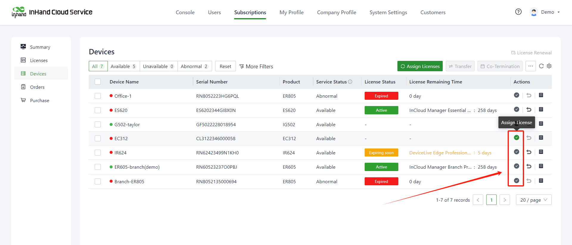 1. On the "Subscriptions>> Devices" page, click on the "Assign License" option in the operations column (These devices that have already applied a license).