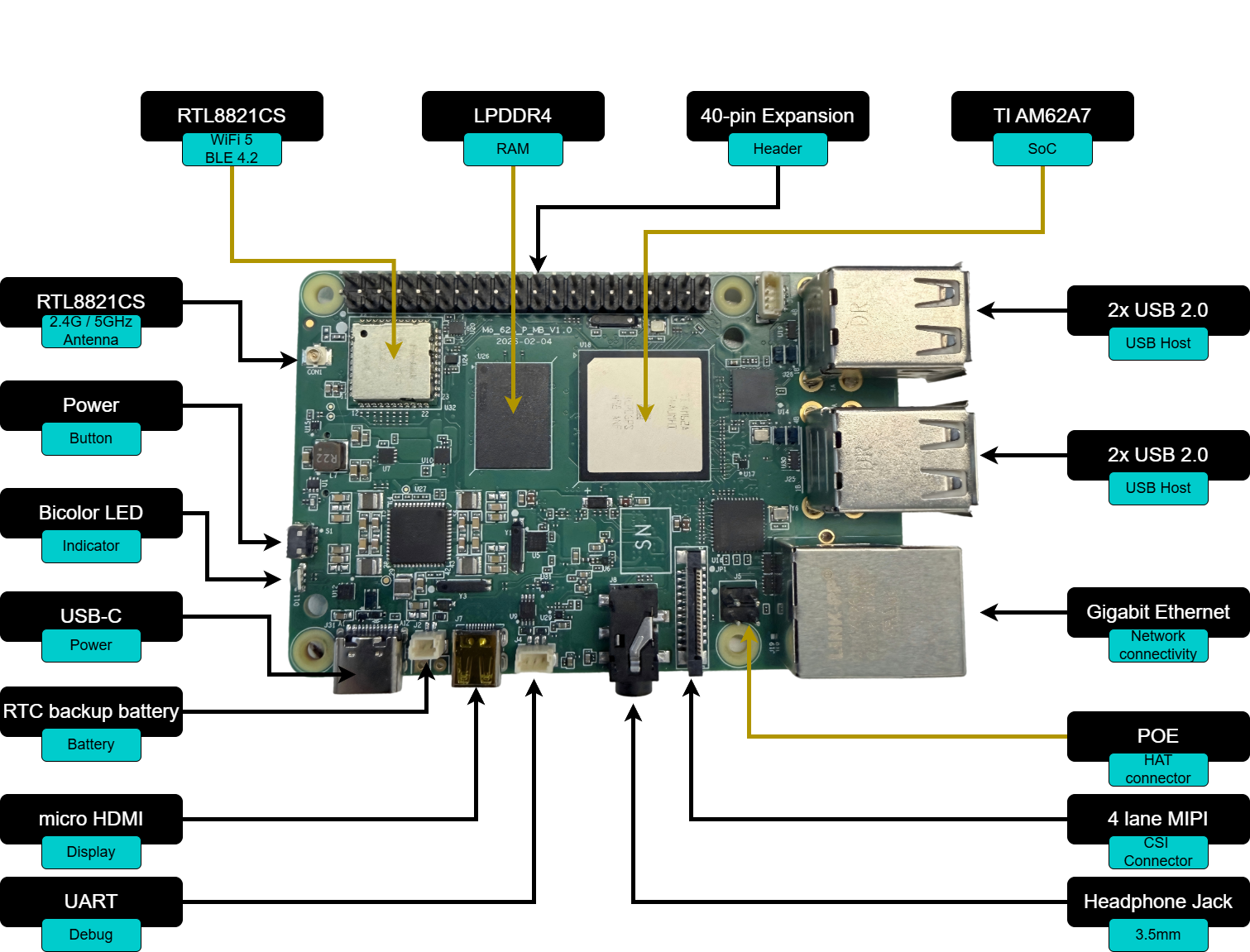 | SoC | TI AM62A74 (Quad-core Cortex-A53 @ 1.4 GHz + Cortex-R5F) |