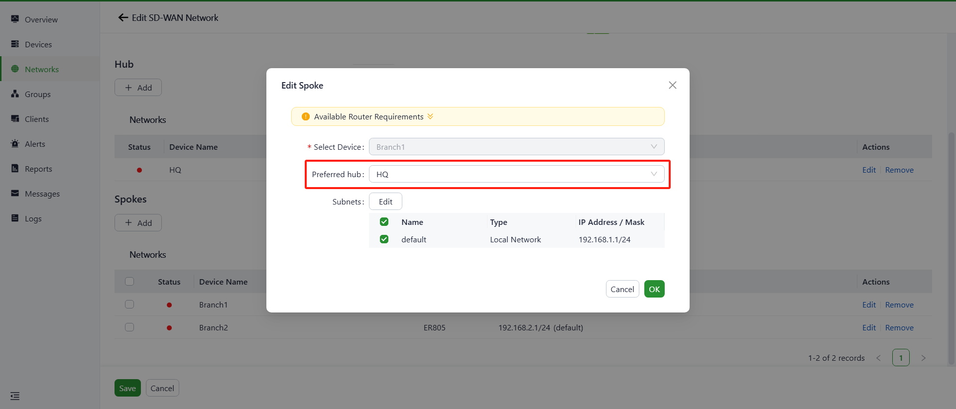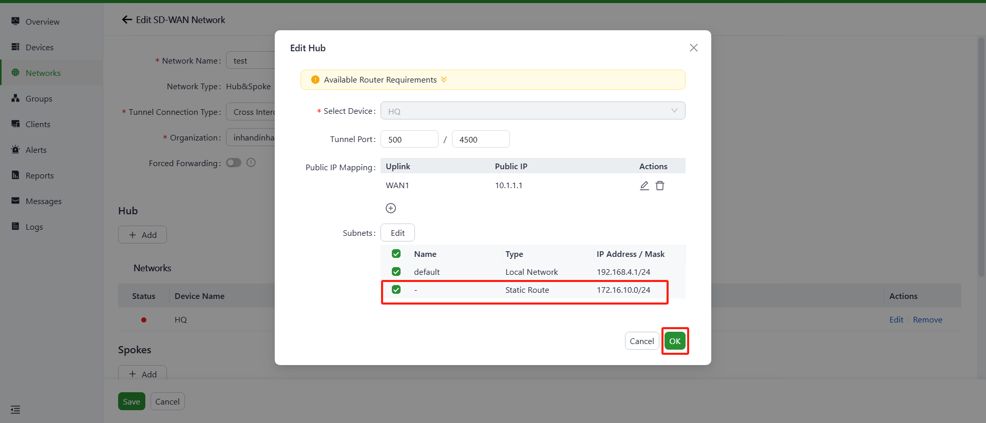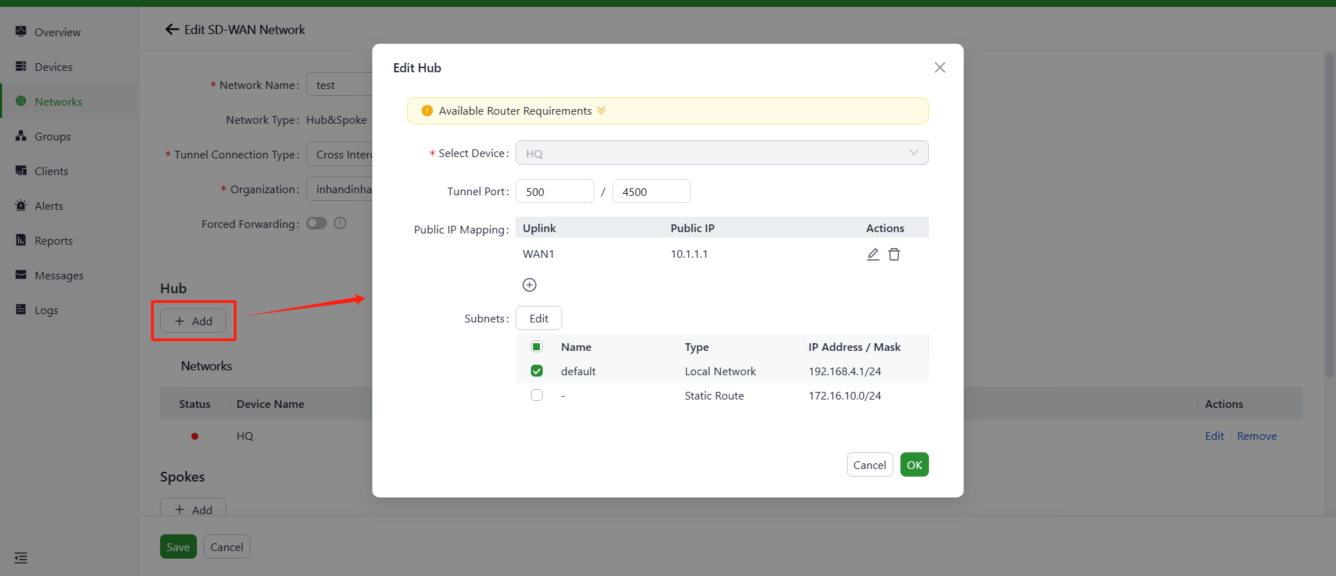 1.Edit the Subnet of the hub device to enter the configuration editing page.