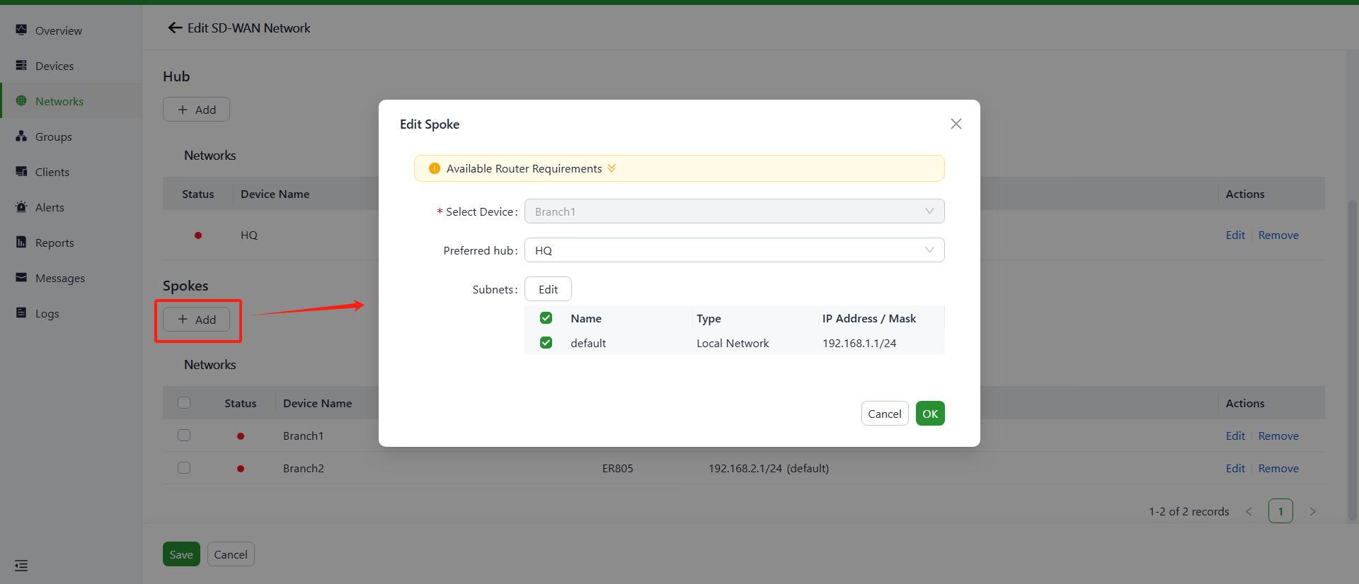 5.Follow the above steps to add other required branch devices. This example also adds a branch device with the subnet 192.168.2.1/24.