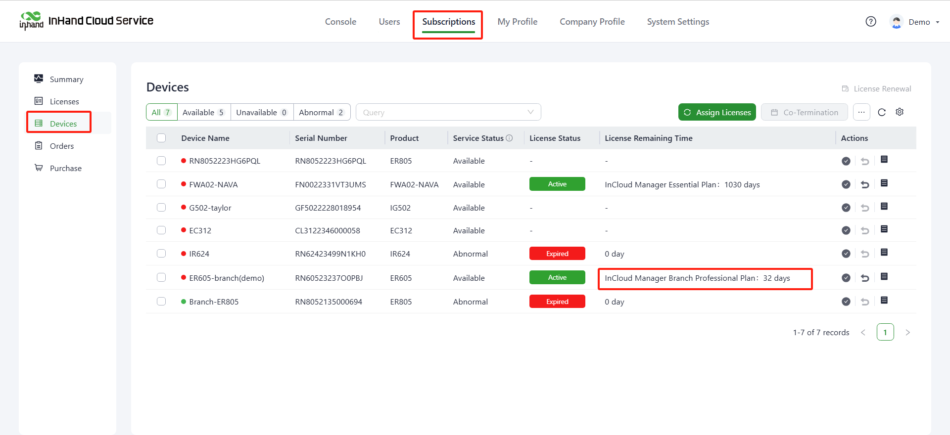 This error occurs when the device has no license or the license type is not InCloud Manager Branch Professional Plan. You need to go to the Subscriptions menu in InHand Cloud Service and apply the InCloud Manager Branch Professional Plan license for the device.