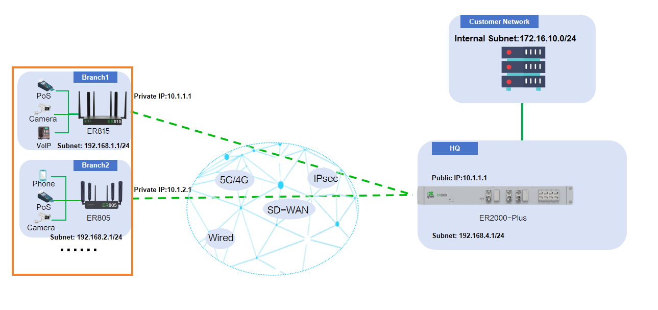 Headquarters (Center): ER2000-Plus. WAN Port Public IP: 10.1.1.1, Subnet: 192.168.4.1/24