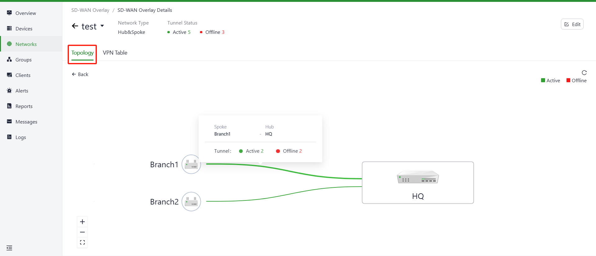 You can check the tunnel establishment status between branch devices and the center device through the SD-WAN topology map.